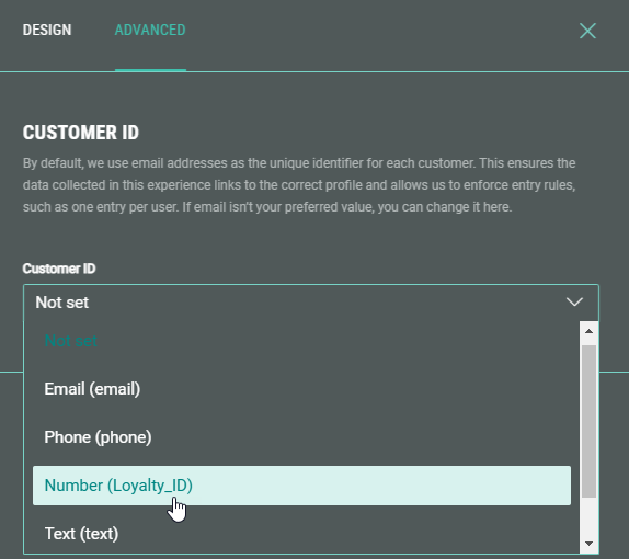 - Navigate to the Advanced tab and select the desired Customer ID from the drop-down (e.g. Loyalty_ID).