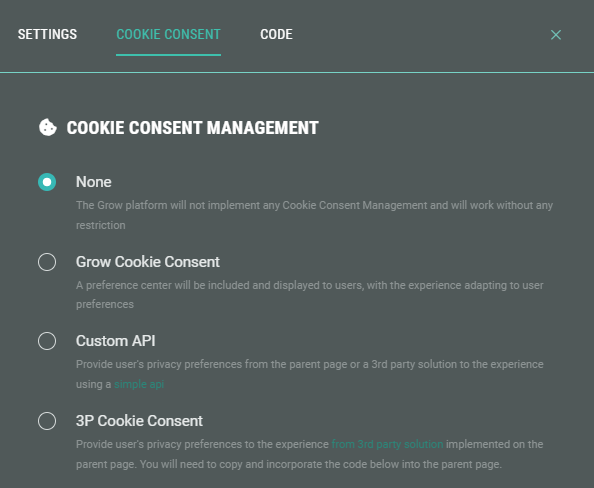 • None — The Grow platform will not implement any Cookie Consent Management and will work without any restriction.