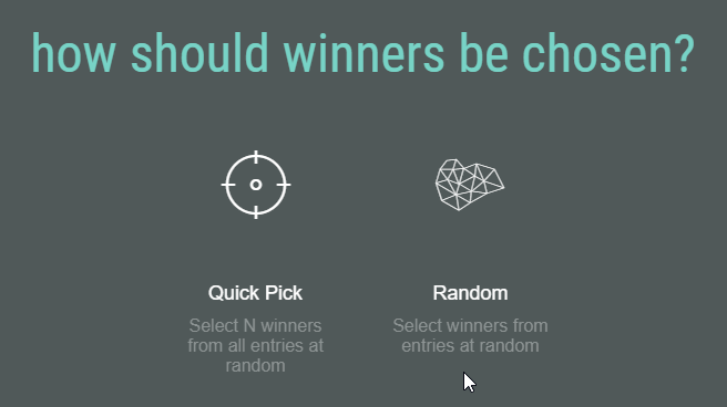 Selection Method: The winner selection wizard will appear and you'll be asked how you'd like to select winners. You can choose between Quick Pick and Random for all campaign types. Contests will also give you an option to select entries based on Top Votes and Judges Selection.- Quick Pick will allow you to select a defined number of winners at random.