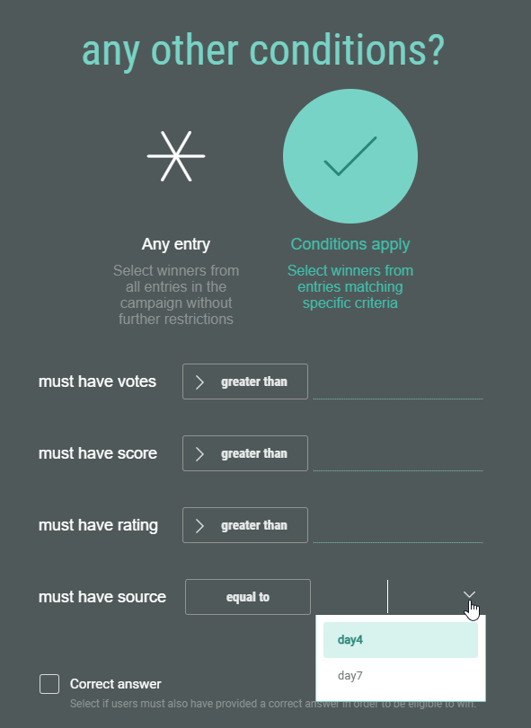 Additionally, you can check the Correct answer box, if Experience entrants must also have provided a correct answer in order to be eligible to win. (e.g. If the Experience contains a Quiz).
