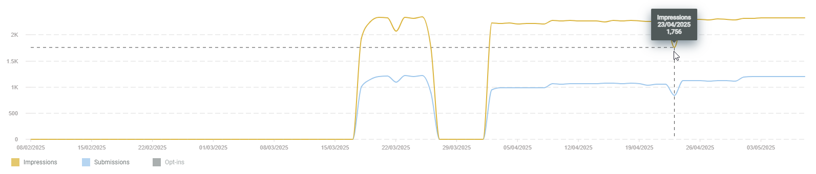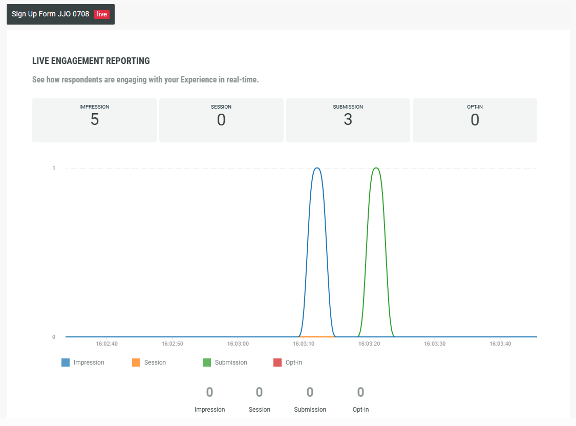 At the time we checked the live insights (16:03), we saw 1 impression (marked by the blue spike) followed shortly by 1 submission (the green spike).