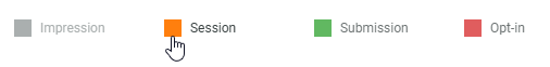 • Funnel — The funnel view shows the totals per KPI within the selected date range. It's in the form of a conversion path, starting with impressions (participants entering the Experiences), moving into submissions (forms completed by participants), and ending with opt-ins (entries where the participant consented to one or more opt-ins).