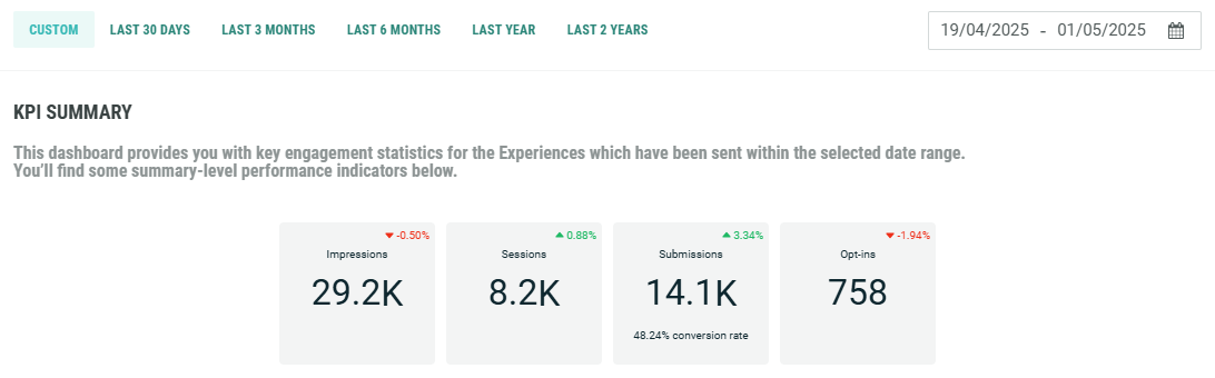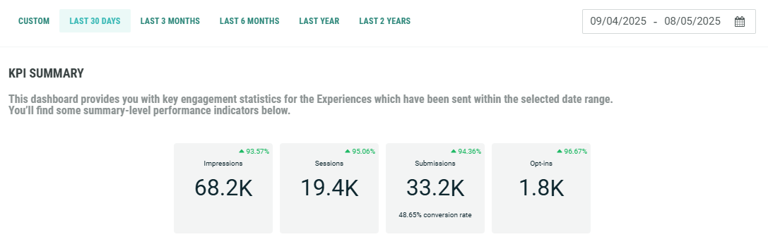The KPI summary provides key engagement statistics for the Experiences which have been sent within the selected date range.
