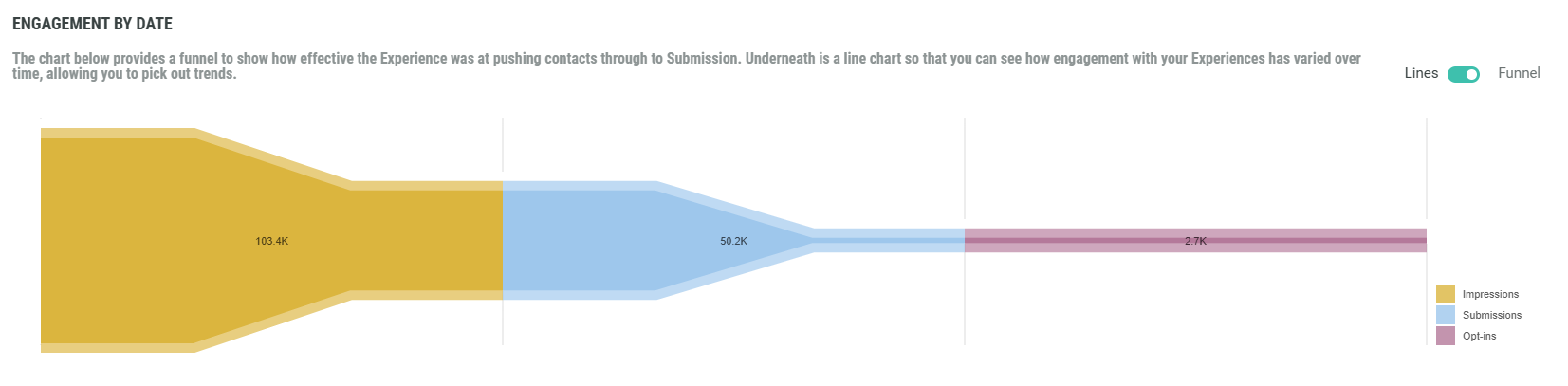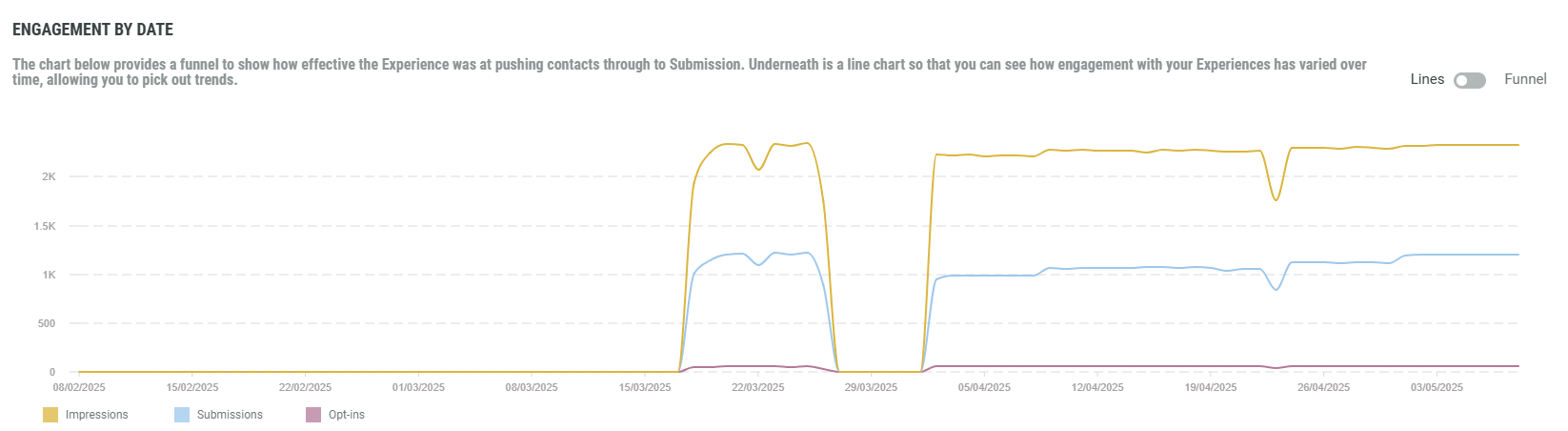 Engagement by date shows how effective the Experience was at pushing participants through to submission (=submitted the form).