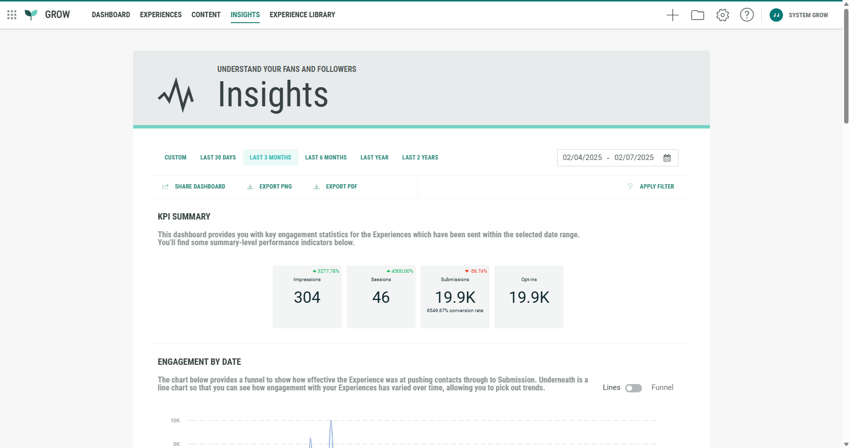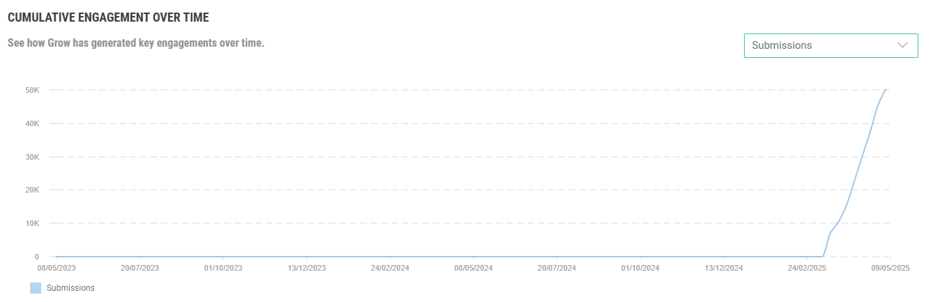 See how Grow has generated key engagements over time, presented in a line chart by KPI.