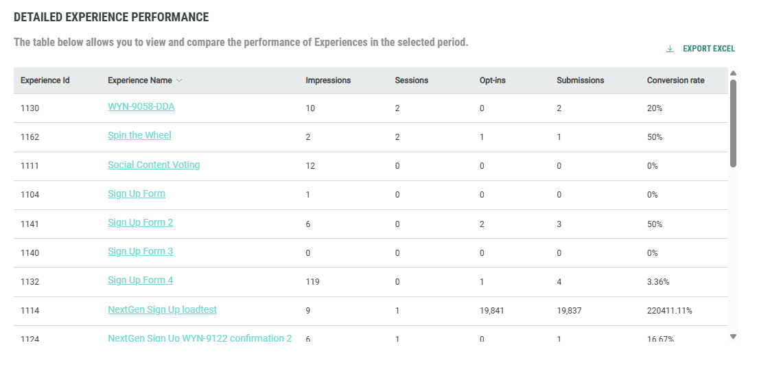 A table view allows you to view and compare the performance of Experiences for the selected date range.