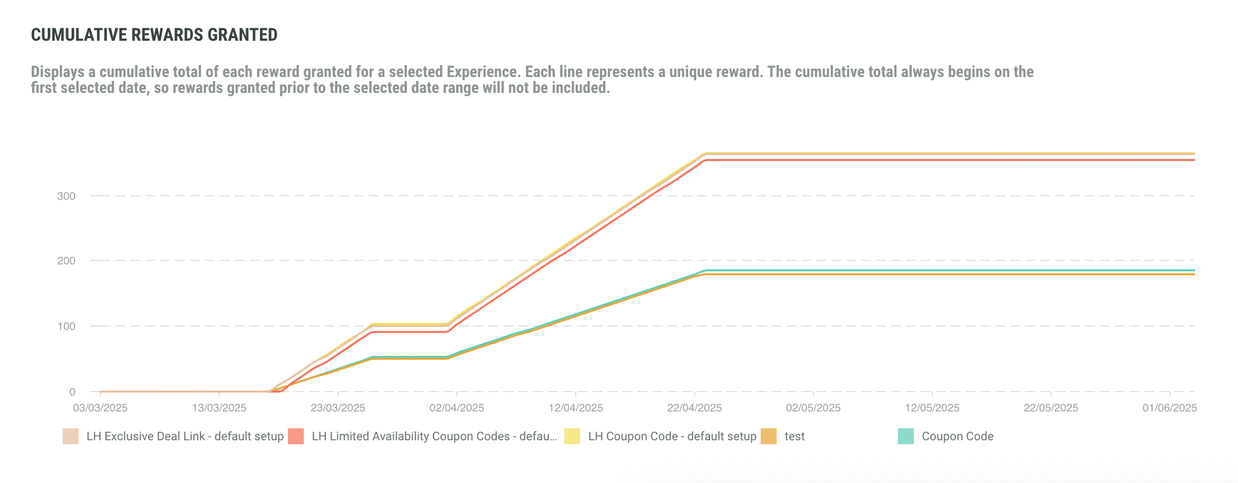 The lines show the total count of each reward granted prior to the date range and how that total changed over the selected period.