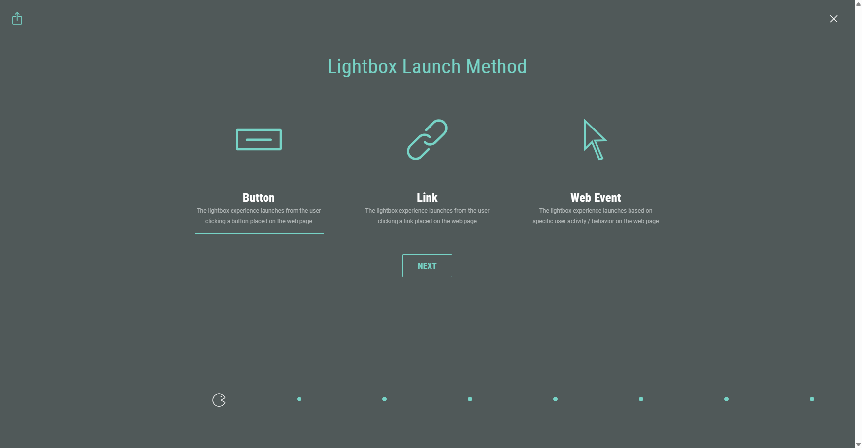 - Button — The Experience launches in a lightbox after clicking on a button on the web page.