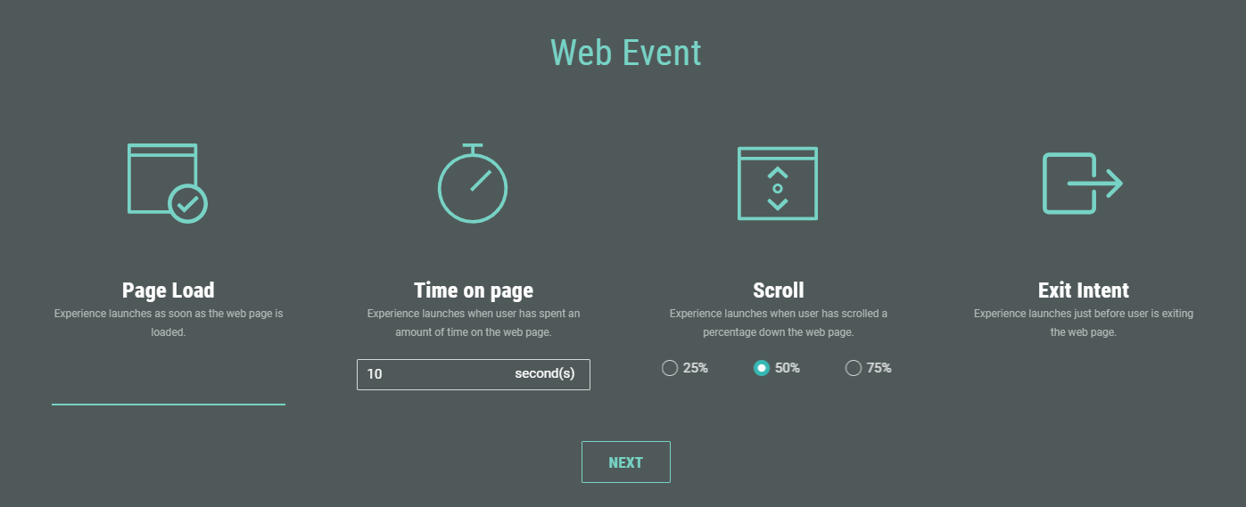 Scroll — Launches the Experience when the visitor scrolls to a certain point on the page. Choose 25%, 50%, or 75%.