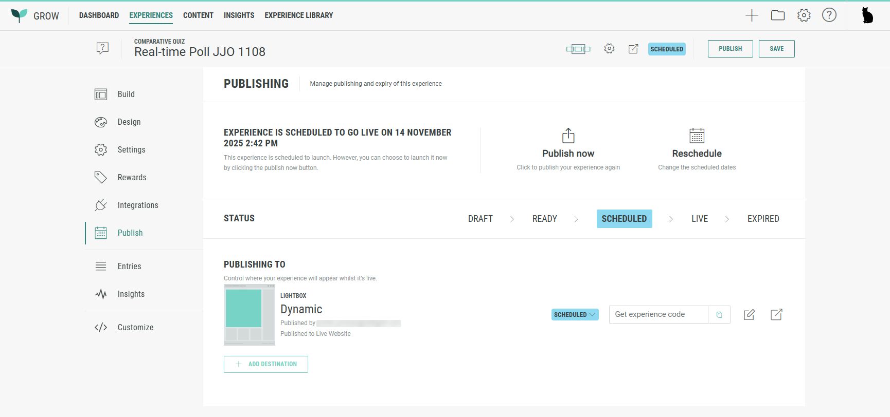- The text: Experience is scheduled to go live on [publish date and time].