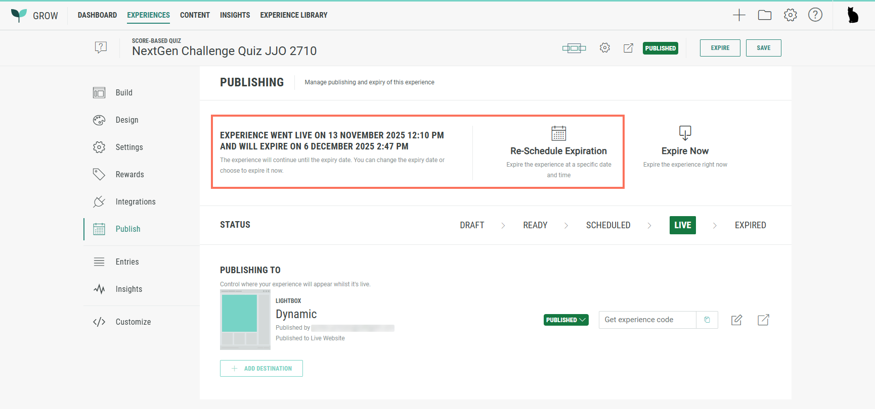 - The text: Experience went live on [launch date and time], expire when ready.
