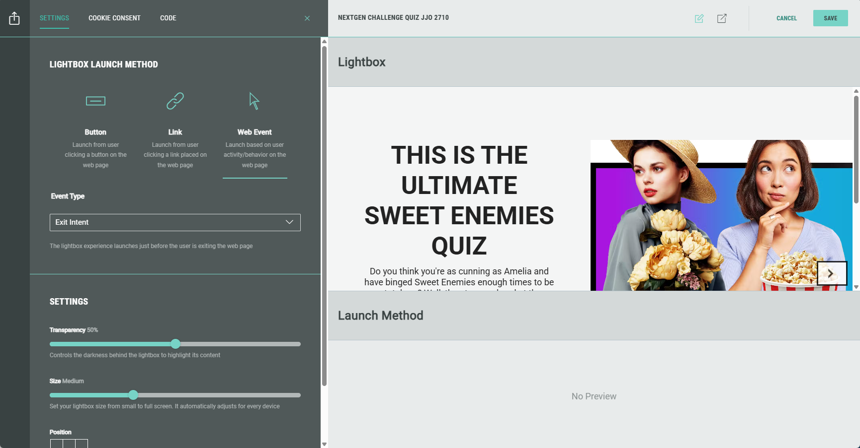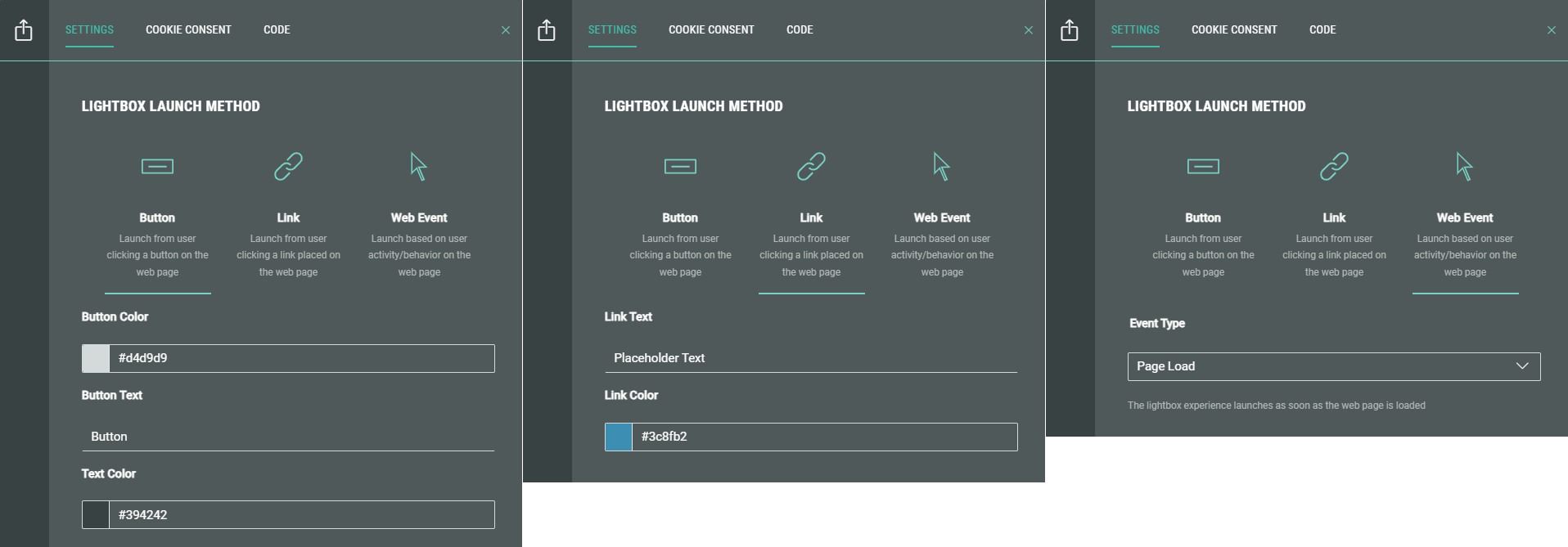 - Web Event — The Experience launches in a lightbox based on a specificuser action or behavior on the web page.