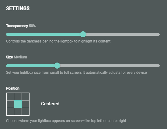 - Transparency — Controls the darkness behind the lightbox to highlight its content.