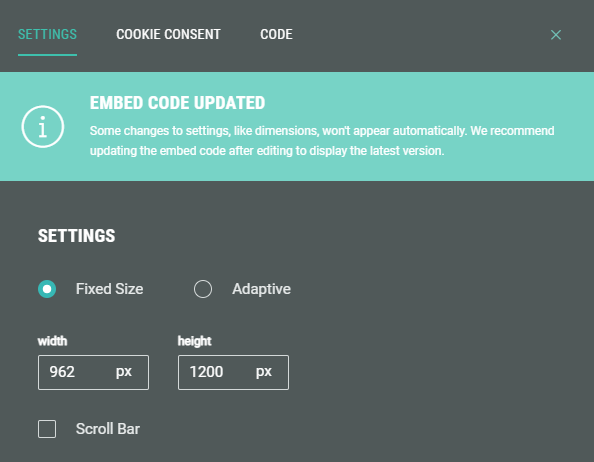 Note: Some changes, like dimensions, won't appear automatically. We recommend updating the embed code on your web page after editing, to display the latest version. Otherwise, the latest changes might not be reflected.