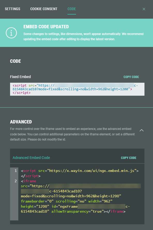 On the Code tab, you can see the default embed code to be added to your web page for this Experience, as well as a more advanced embed code.