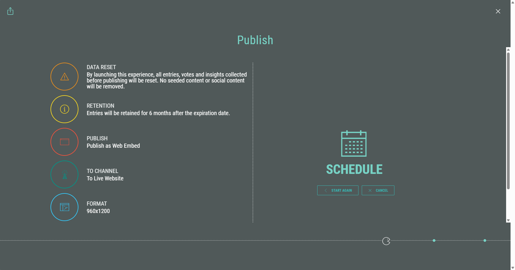 On the Publish step, you can decide to schedule the Experience, making it available for participants on a later date and time), or to publish now (making it available immediately).