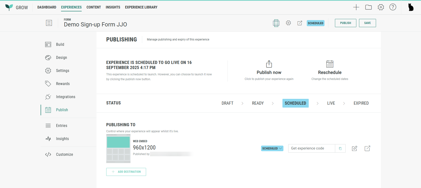 - A Publish now button is available to publish the Experience immediately. When clicked, the Experience and all of its scheduled destinations below get published immediately.