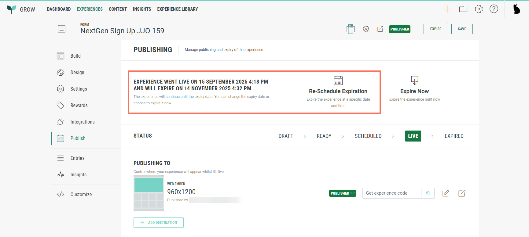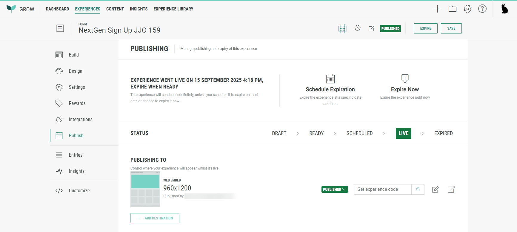 - The text: Experience went live on [launch date and time], expire when ready.