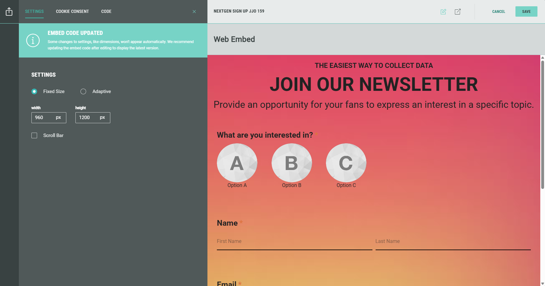 It contains the tabs: Settings, Cookie Consent and Code.