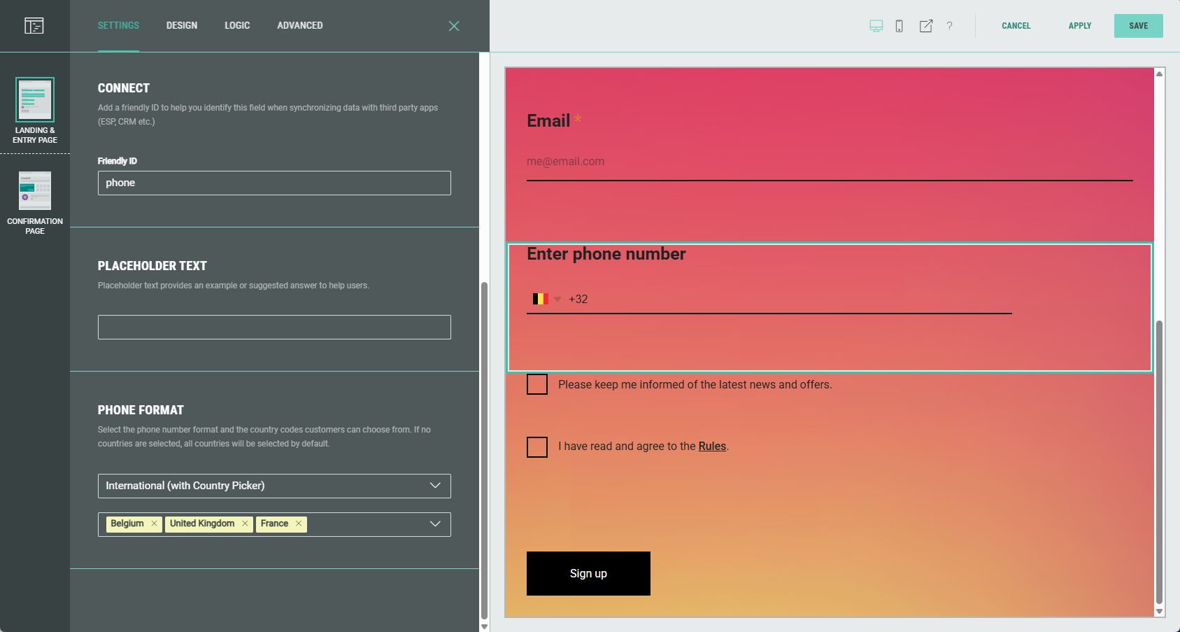The Phone module can be used within a Form Section to ask Experience participants for inputting their phone number. You can limit the applicable countries for which phone numbers can be submitted.