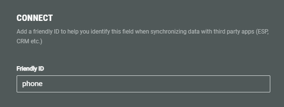 1. Connect — You can add a Friendly ID to help you identify this field when synchronizing data with third party apps (ESP, CRM etc.)