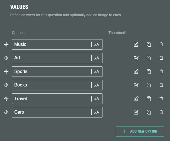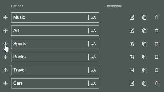 - Image — If desired, you can add an image that will be set as thumbnail for the option.