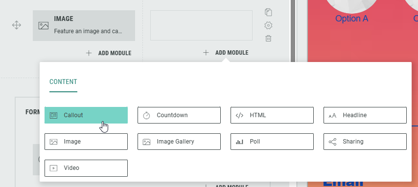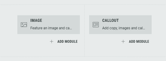 1. Continuing from a 2-column row example, let's add an Image module in the left column and a Callout module in the right one.