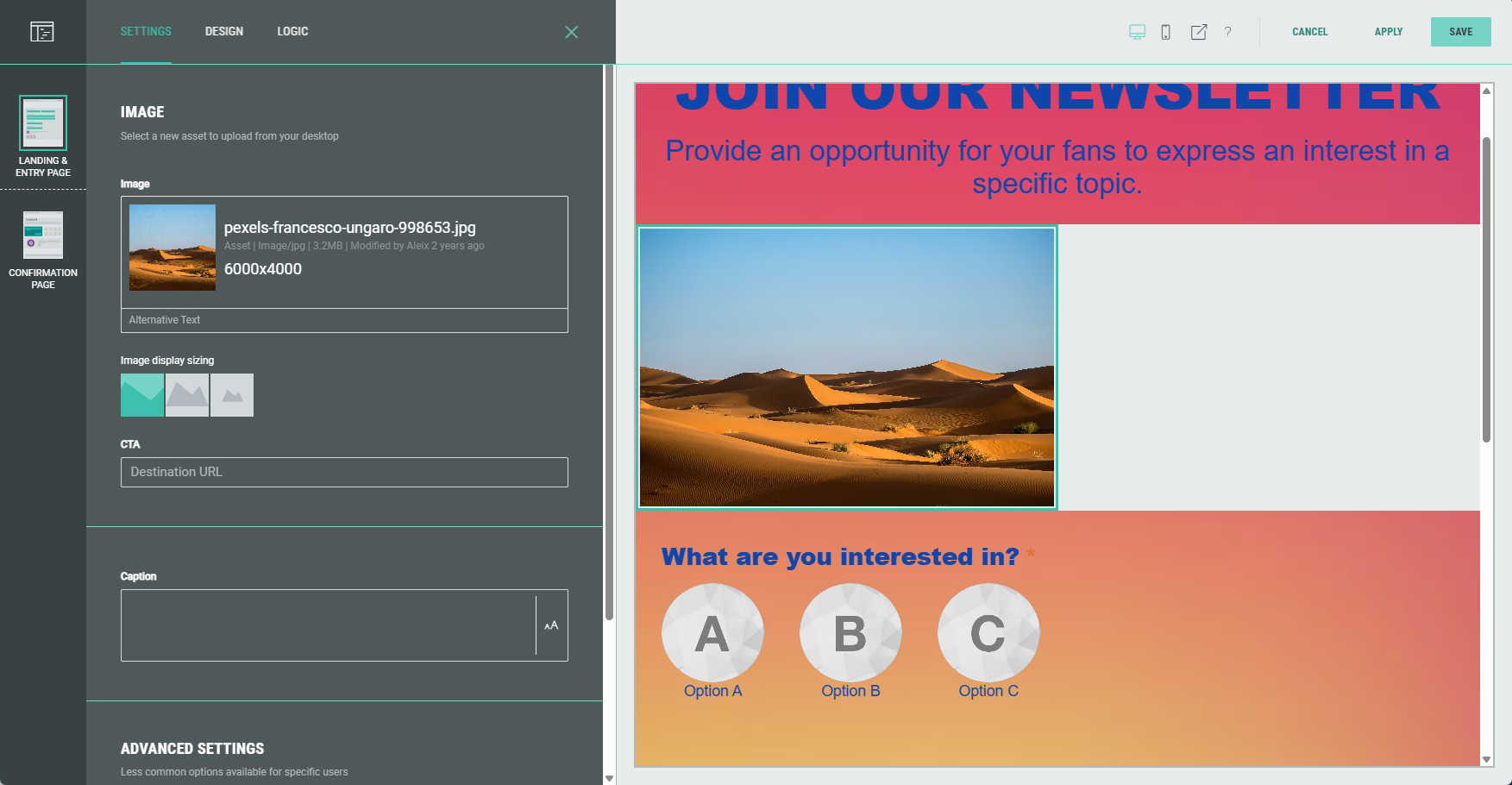 The selected image is visible as a thumbnail in the settings on the left, and in the preview on the right as it will be shown in the Experience to entrants.