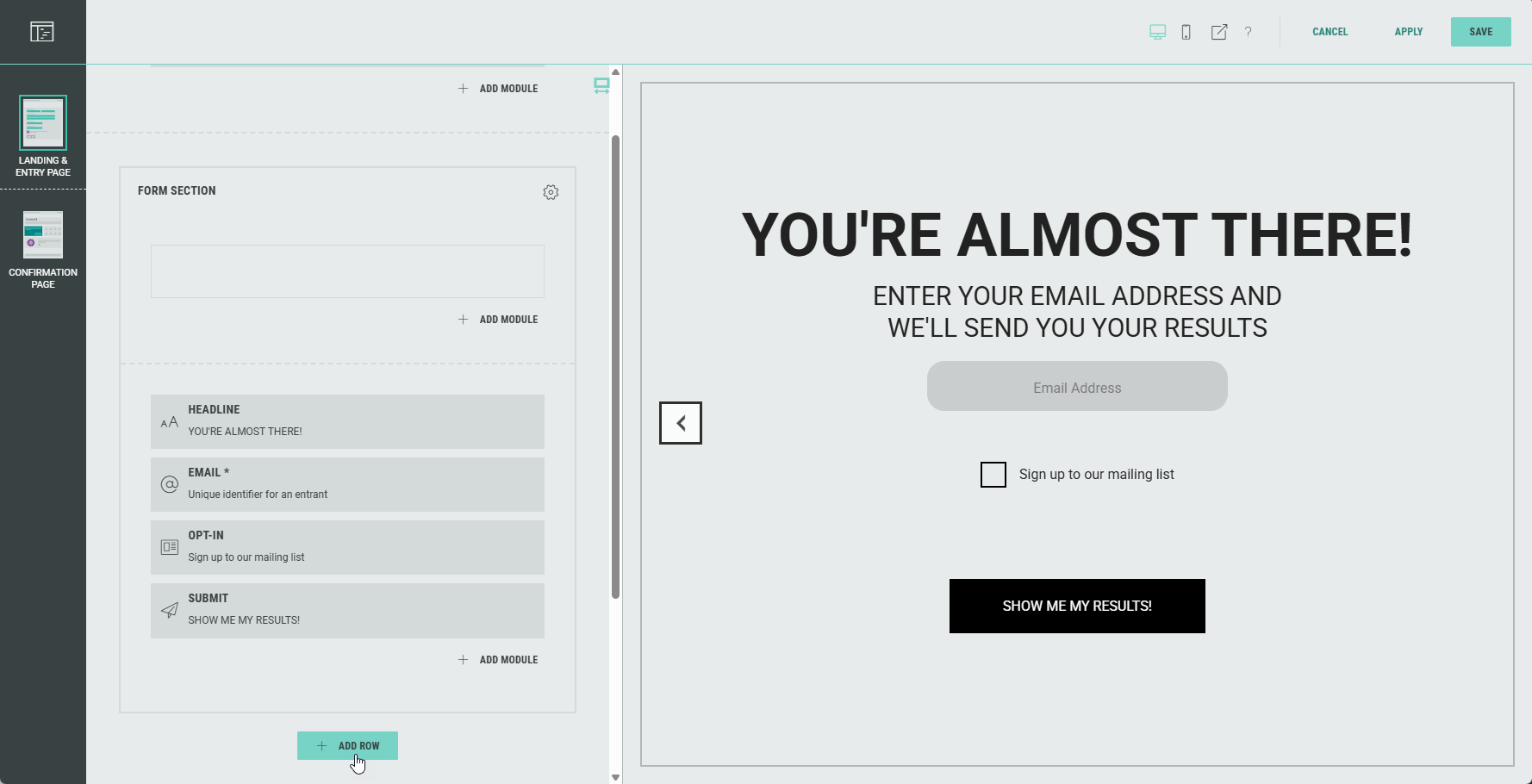 1. To add a new module, click the + Add Module button that appears in each row (in each column for a multi-column row layout).