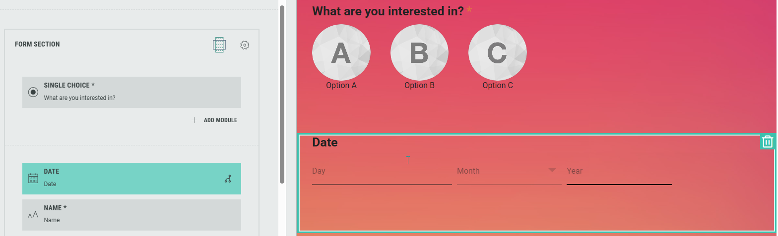 The Date module can be used within a Form Section to ask Experience participants for a date input in a certain format.