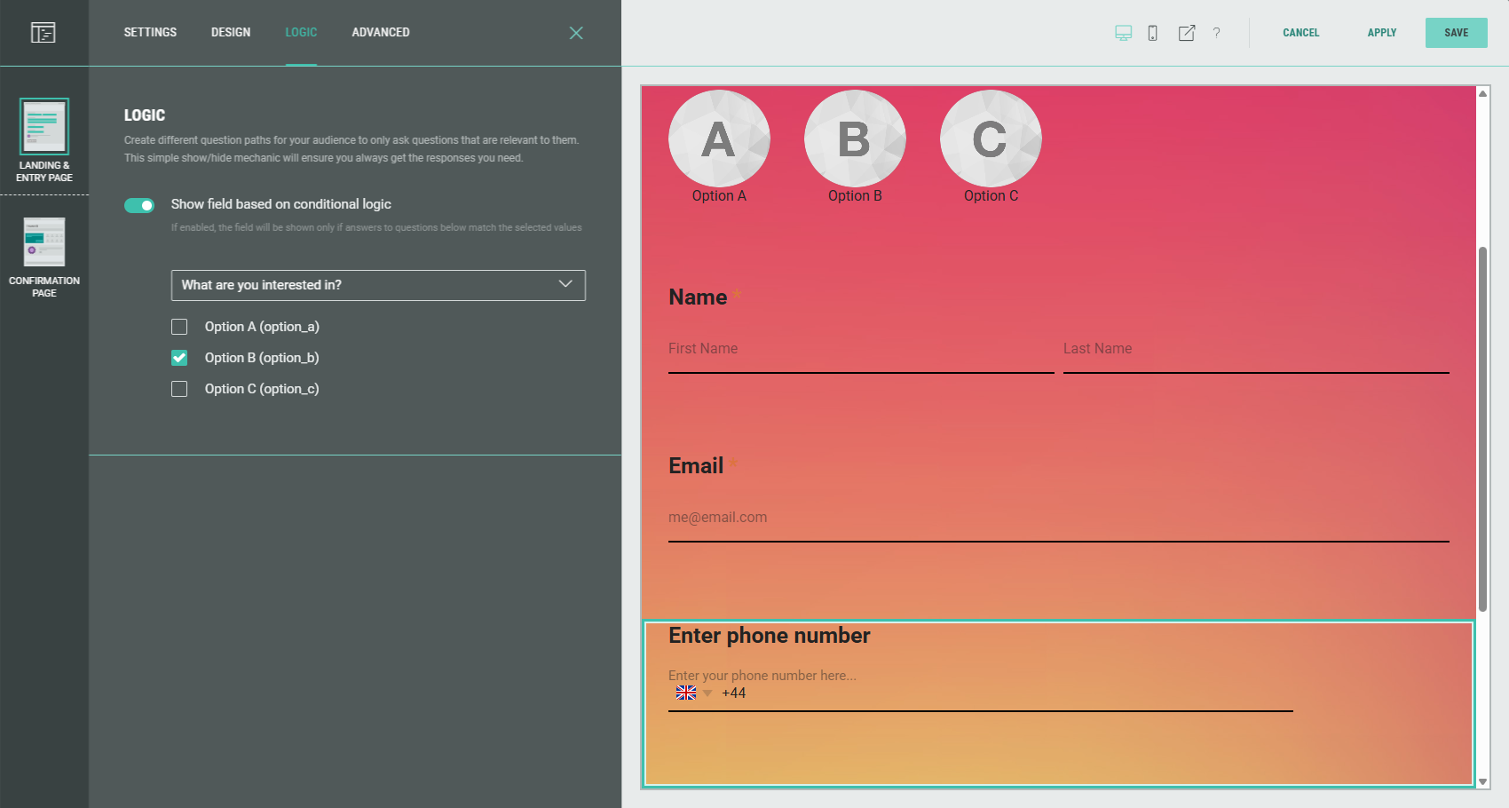 Example: Only show the Phone field when Option B was given as answer to the What are you interested in? question.