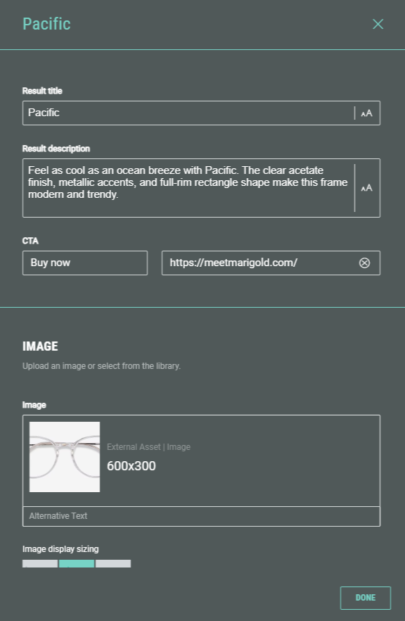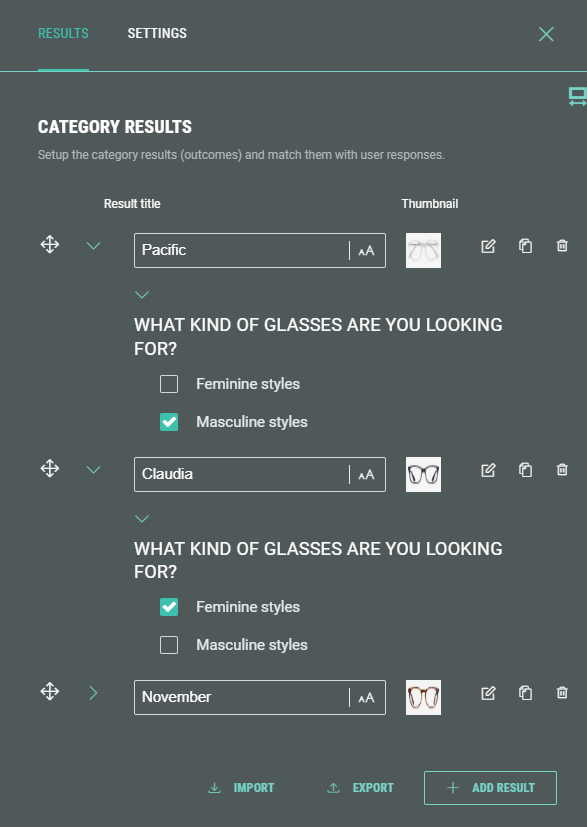 To match participants' quiz answers to results, set the criteria for when to display each result (for example, Masculine style shows Pacific glasses, while Feminine style shows Claudia glasses).