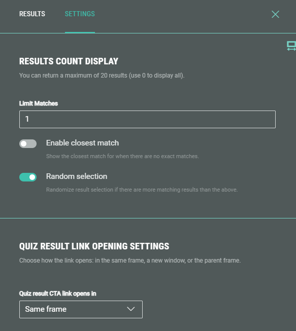 Enable closest match — Enabling this toggle results in participants to still see a result that fits best to their answers when no exact match is found.