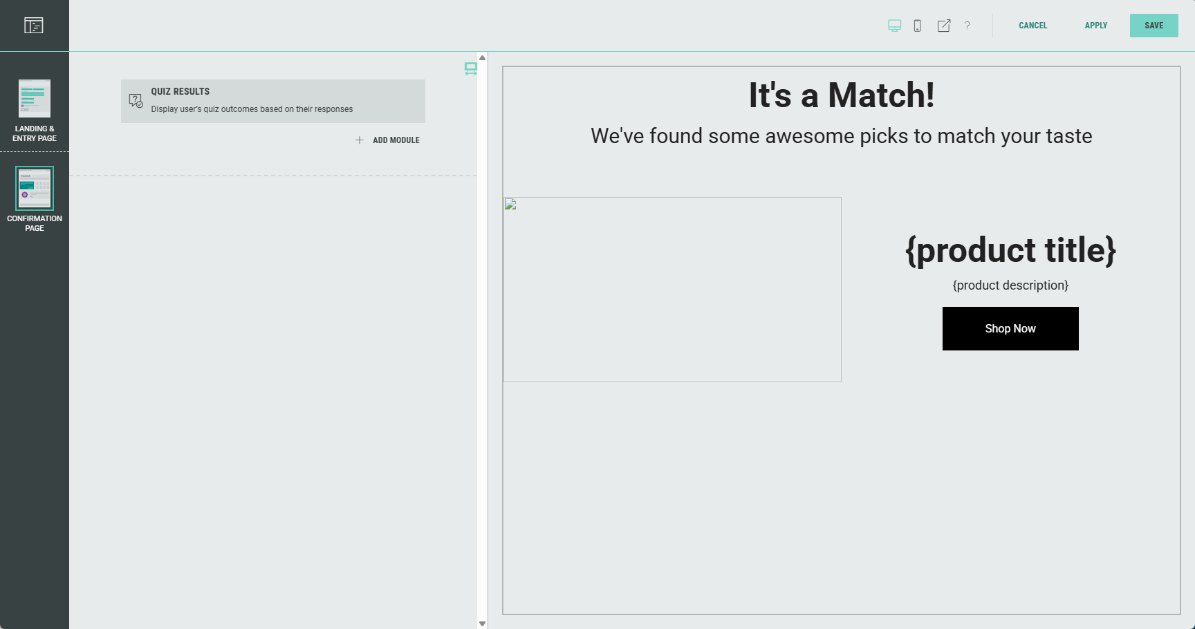 The Quiz Results module is a participation-type module and is used to display results from a Quiz-type Experience (such as a Shopify Product Quiz) on the confirmation page of the Experience.