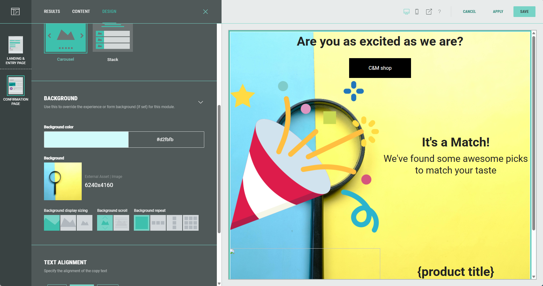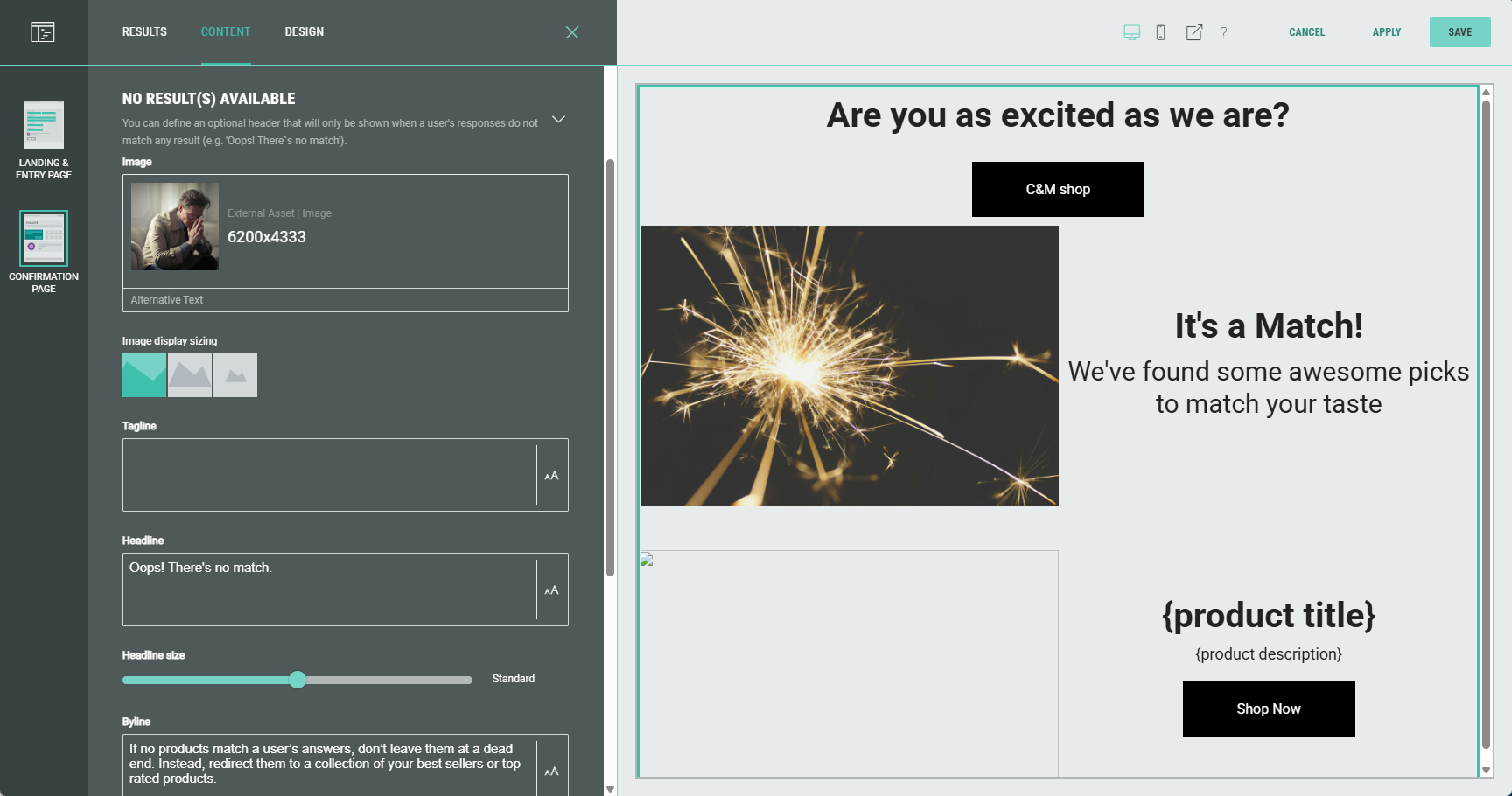 - No result(s) available — You can define text and other copy that will only be shown when a participant's responses do not match any result (e.g. Oops! There's no match).