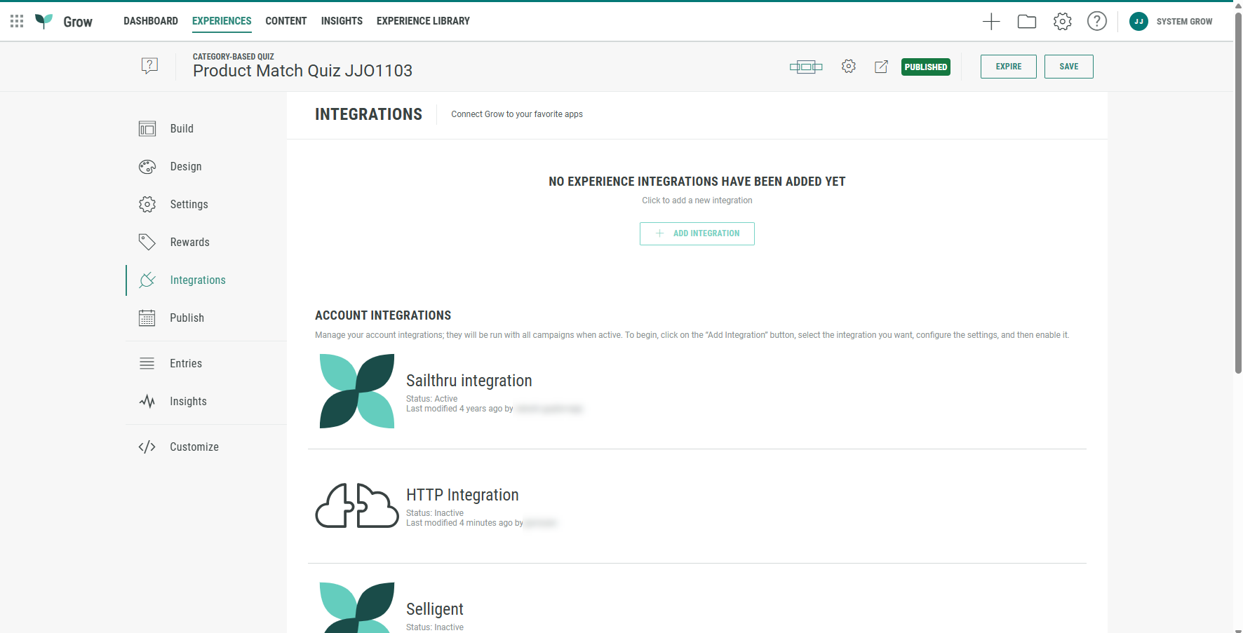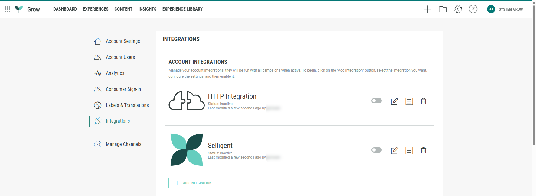 Note: You can set up integrations at the account level and at the Experience level. The process is the same for both, but located in different places in Grow.
