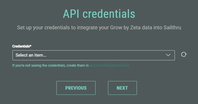 When no Sailthru API Key is configured yet, or when multiple Sailthru API Keys are configured, the API credentials screen is shown.