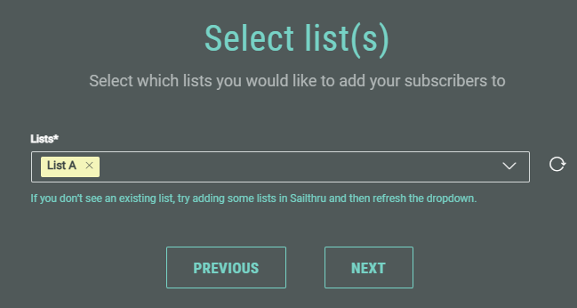 - Select which list(s) you would like to add your subscribers to. Again, ensure that any relevant list has been created in Sailthru. Lists maintain segments of your user base that you can track and message across all channels. Then click Next.