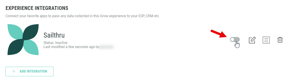 4. Click + Add Integration in the Experience Integrations section (no Account Integrations can be created from here) and set up a Sailthru Integration.