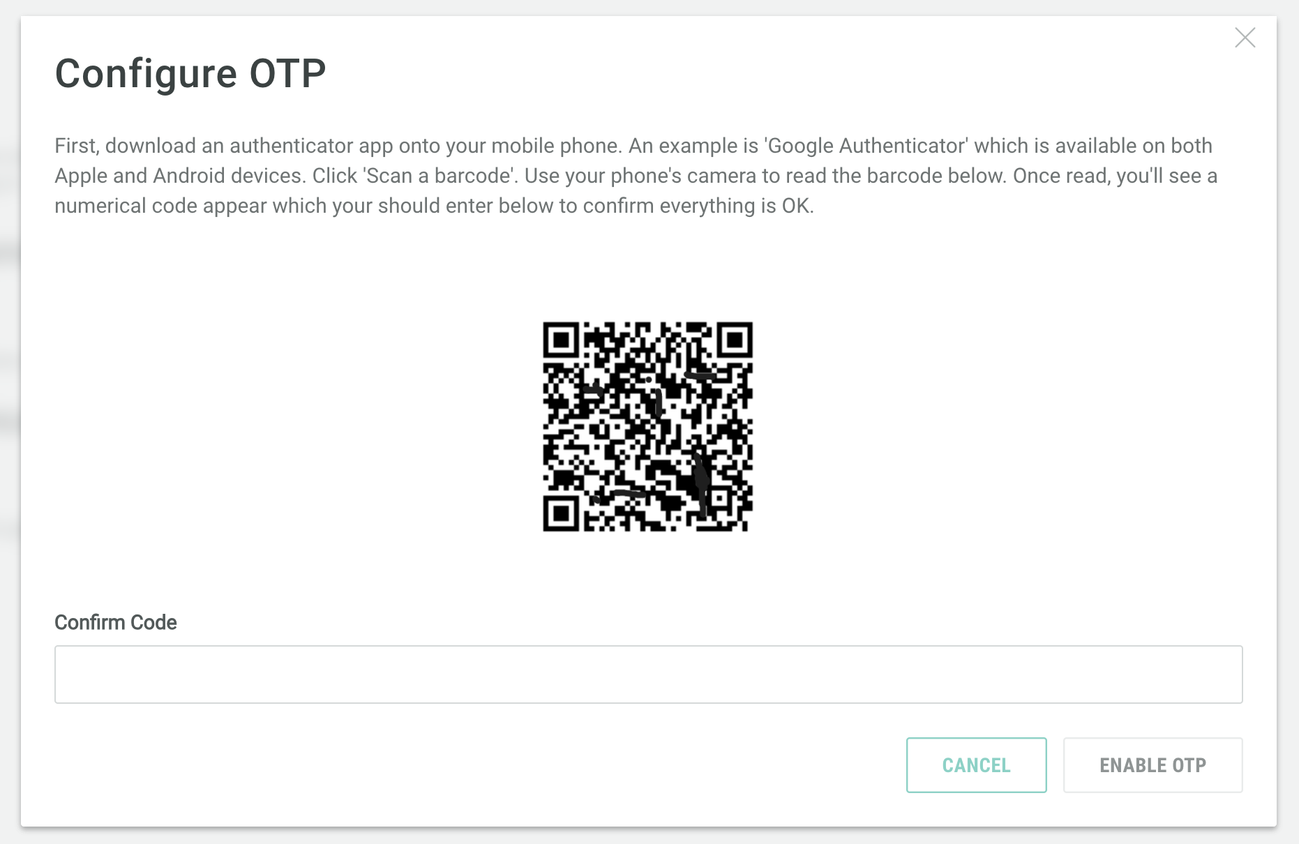 Within the Configure OTP pop-up window, enter the authentication code in the Confirm Code field.
