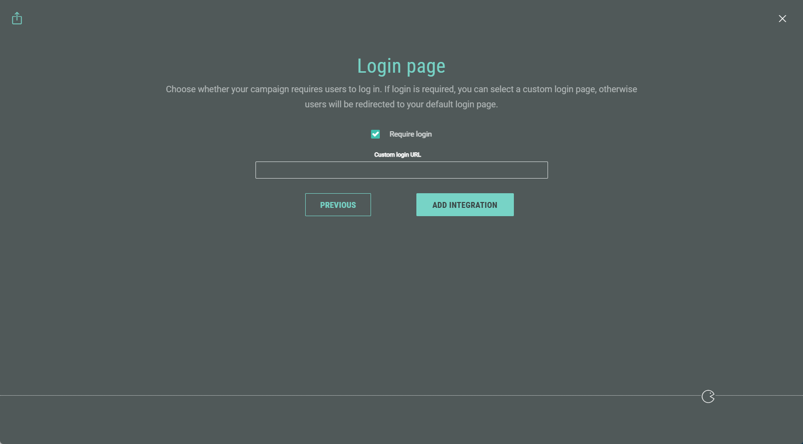 - Choose whether your Experience requires participants to log in. If login is required, you can set a custom login URL. Otherwise users will be redirected to your default login page.