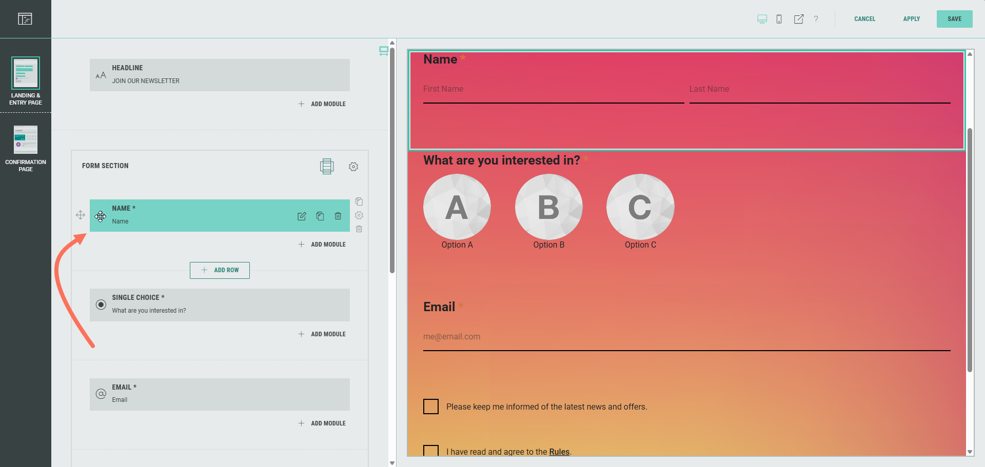 - We want to personalize the label in the Single Choice module in the Form Section, so it shows the participant's first name once they're logged in through SSO (OpenID). To do so, first move the Name module so it's above the Single Choice module.