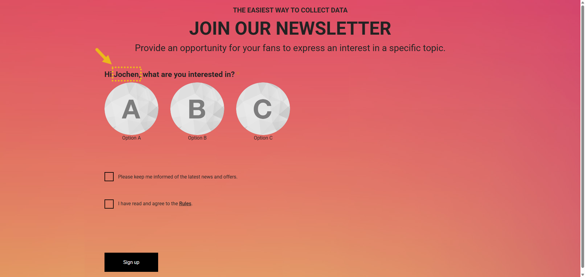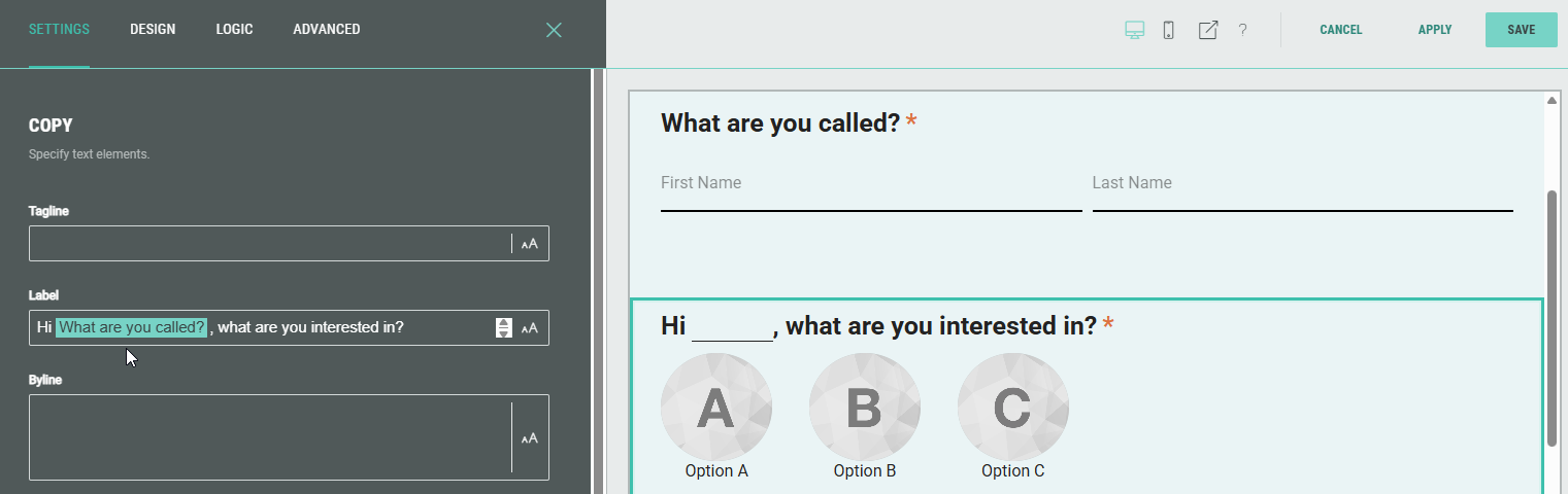 - Then click the Single Choice module and update the default Label from What are you interested in? to Hi Name, what are you interested in?. To enter the Name personalization field (also called a token), type an @ sign. The Name field will automatically pop up for selection.