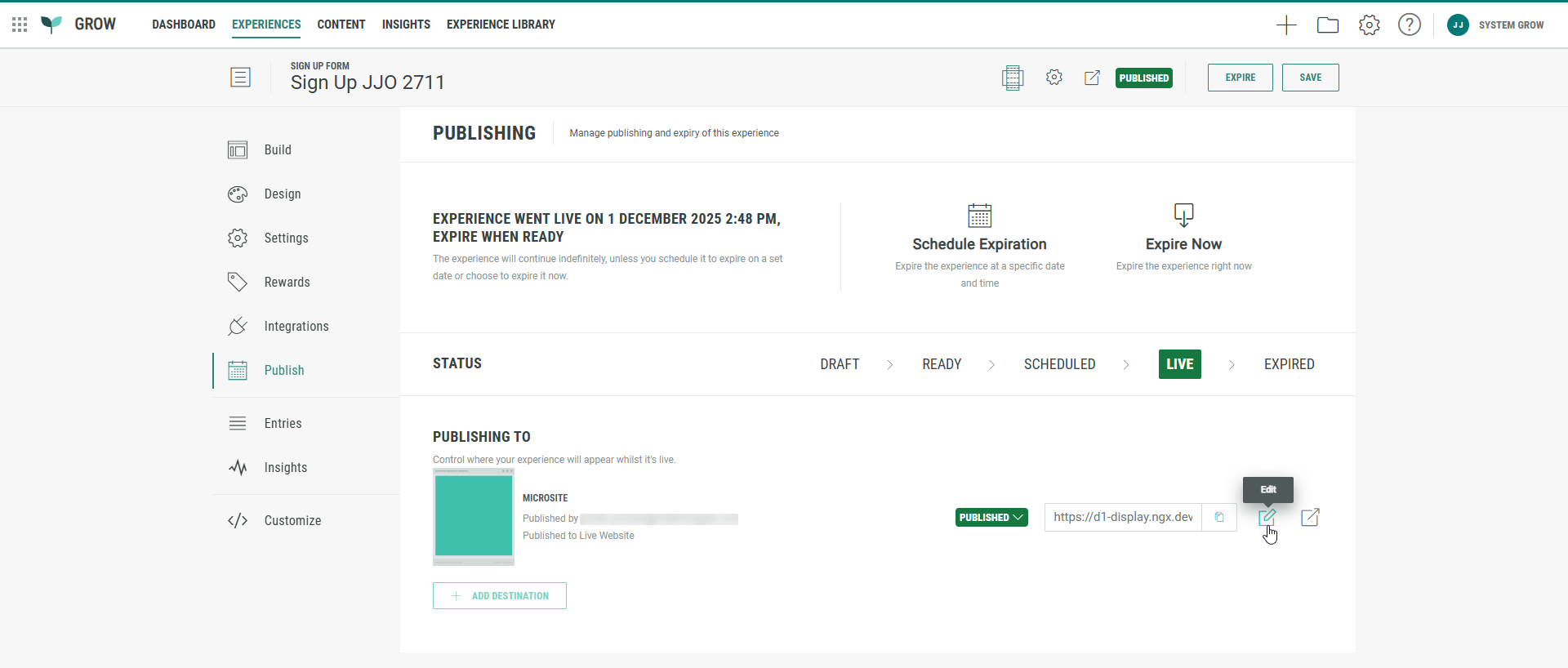 - Once published, edit the publishing destination by clicking the Pencil icon on the right.