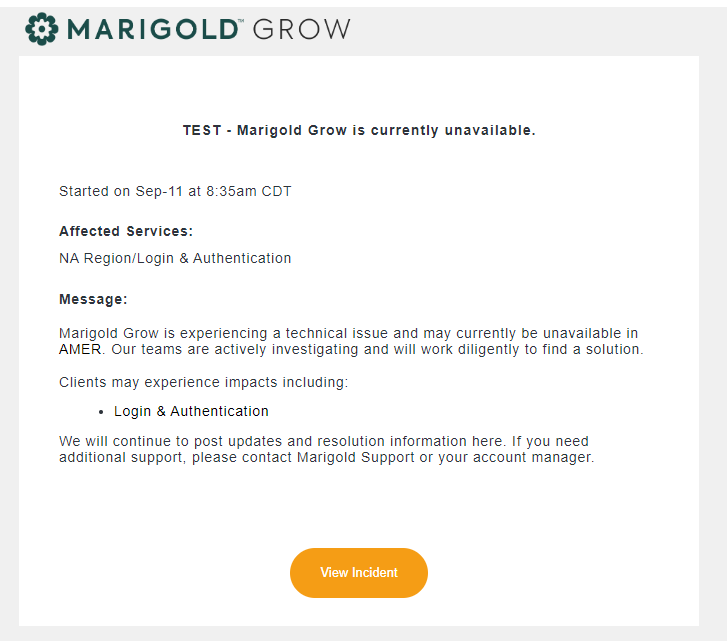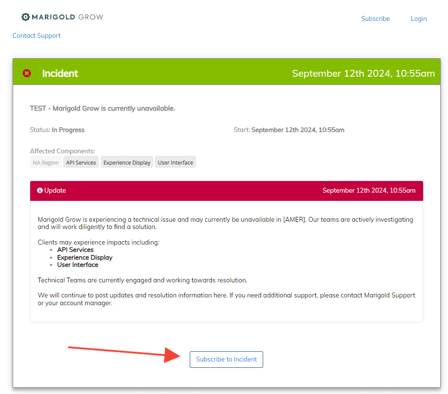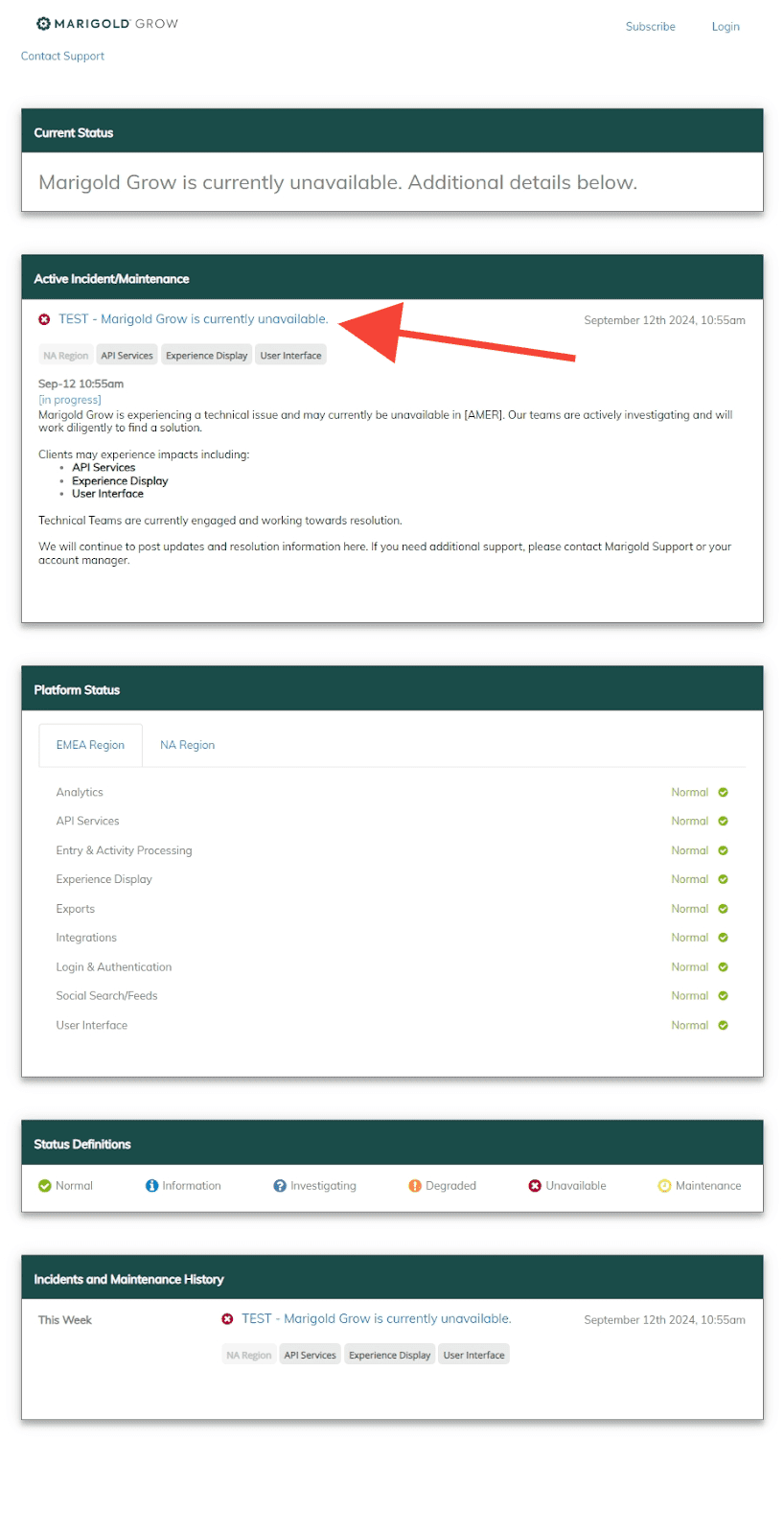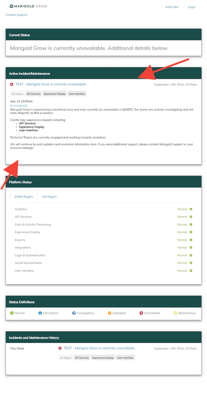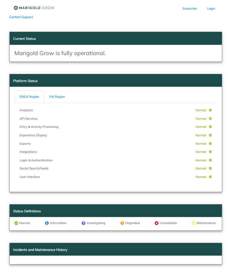 The status page provides you with regular updates regarding the status of the Grow platform in the event of a major system incident in your region.