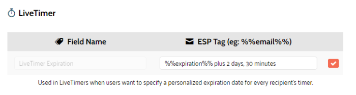 LiveTimer Expiration — Used in LiveTimers when users want to specify a personalized expiration date for every recipient's timer. Use the following syntax for the ESP tag: %%expiration%% .