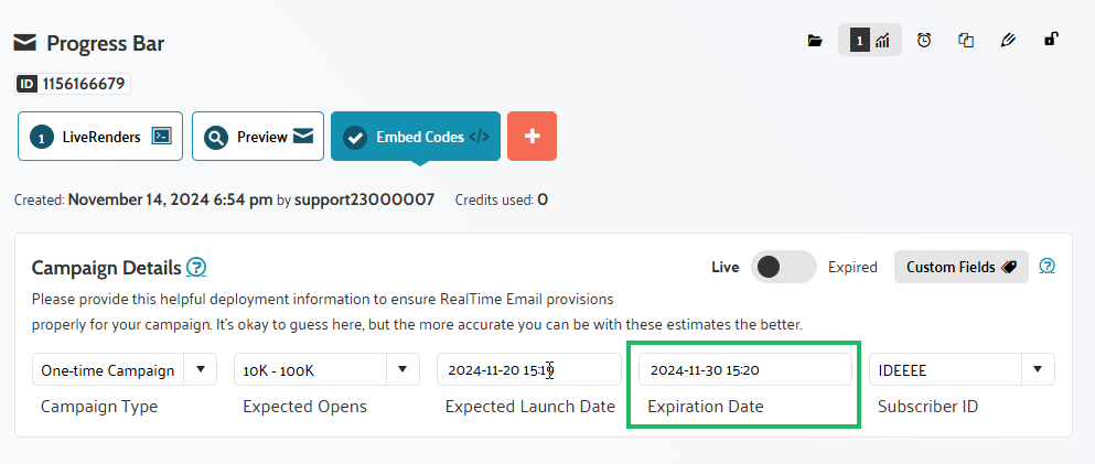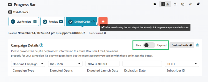 A control exists in the upper right of the Embed Codes tab; simply slide the toggle switch over from Live to Expired.