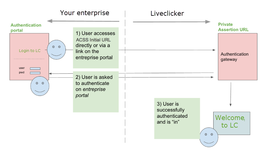 After you've enabled SAML as the type of single sign-on for your Liveclicker, users who visit Liveclicker account and attempt to sign in are redirected to your SAML server for authentication. Your users' identities can be stored either on the SAML server or can be validated by an identity directory such as Microsoft Active Directory or LDAP. Once authenticated, users are redirected back to Liveclicker and automatically signed in.