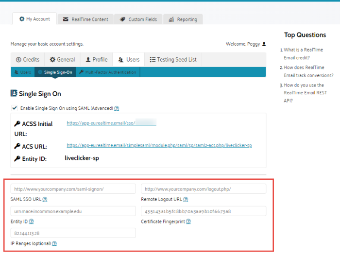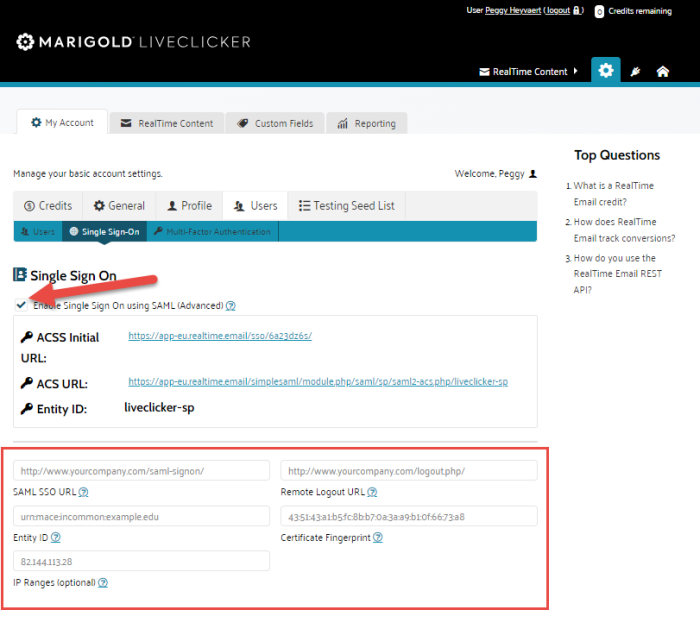 In order to finish the SSO configuration, you will need to add some parameters in the Liveclicker platform under Account Settings -> Users -> Single Sign On.