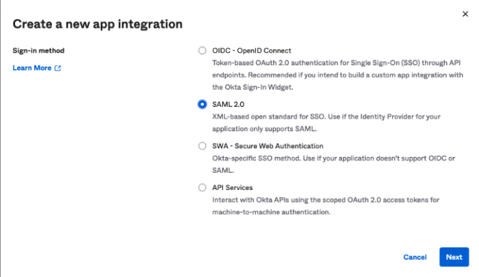 1. First click on Create App Integration to create a new integration and select SAML 2.0